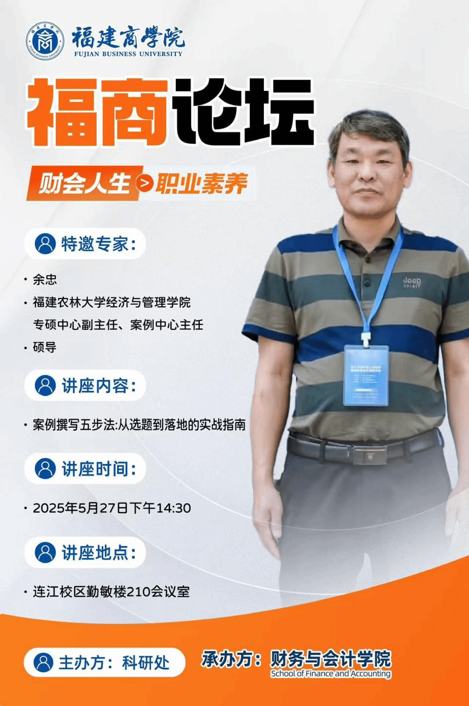 为进一步提升教师管理教学案例的开发水平,助力教学质量和科研能力的双向突破,5月27日下午,我院再次邀请福建农林大学经济与管理学院案例中心余忠主任莅临福商论坛主讲《案例撰写五步法:从选题到落地的实战指南》专题讲座,学院全体专任教师参会。