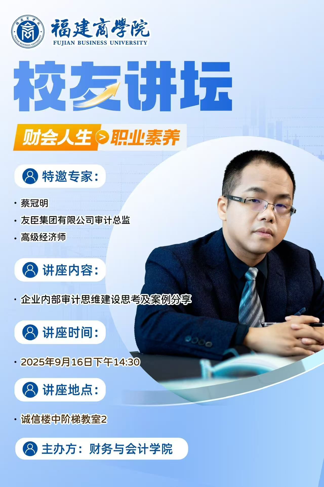 2025年9月16日,02会计与审计专业的蔡冠明校友为我院学生开设了题为《企业内部审计思维建设思考及案例分享》的讲座。